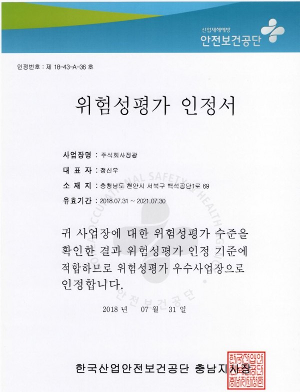 주소 : 31094 충청남도 천안시 서북구 백석공단 1로 69 ㈜정광 Tel :041-621-2886 Fax: 041-621-2888 Copyright © Jung kwang co.,ltd. All rights reserved.